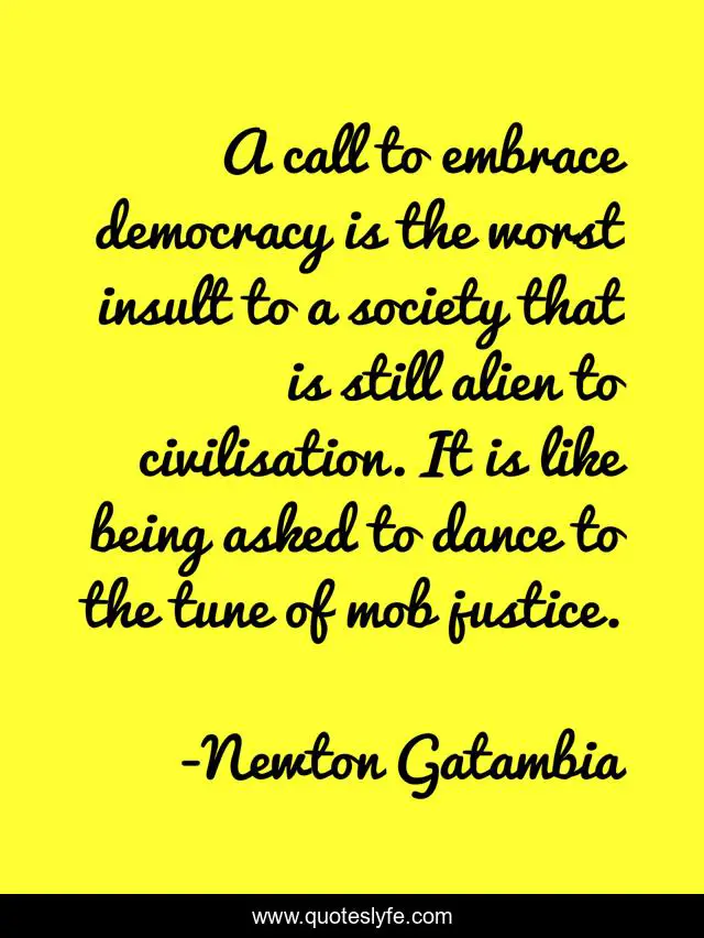 This page presents the quote "A call to embrace democracy is the worst insult to a society that is still alien to civilisation. It is like being asked to dance to the tune of mob justice.". Author of this quote is Newton Gatambia. This quote is about justice, civilization, democracy,.