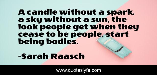 This page presents the quote "A candle without a spark, a sky without a sun, the look people get when they cease to be people, start being bodies.". Author of this quote is Sarah Raasch. .