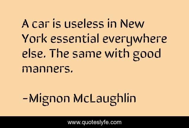 This page presents the quote "A car is useless in New York essential everywhere else. The same with good manners.". Author of this quote is Mignon McLaughlin. This quote is about travel, cities,.