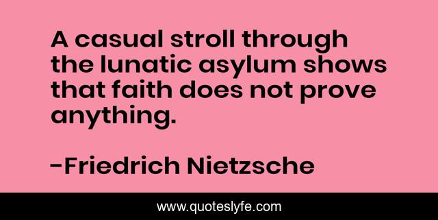 This page presents the quote "A casual stroll through the lunatic asylum shows that faith does not prove anything.". Author of this quote is Friedrich Nietzsche. This quote is about faith, delusions, belief, insanity,.