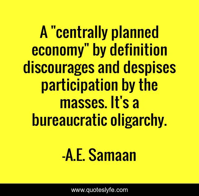 This page presents the quote "A "centrally planned economy" by definition discourages and despises participation by the masses. It's a bureaucratic oligarchy.". Author of this quote is A.E. Samaan. This quote is about oligarchy, libertarianism, central-planners, totalitarian, liberty, progressivism, free-markets, socialism, central-planning,.