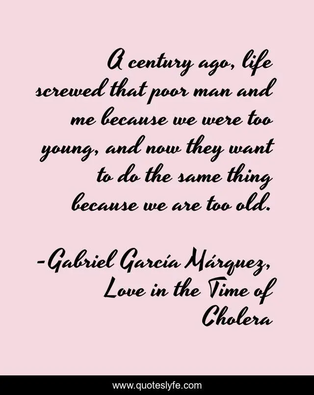 This page presents the quote "A century ago, life screwed that poor man and me because we were too young, and now they want to do the same thing because we are too old.". Author of this quote is Gabriel García Márquez, Love in the Time of Cholera. This quote is about life, lovers, love, love-affairs, elderly, old-age, affection,.