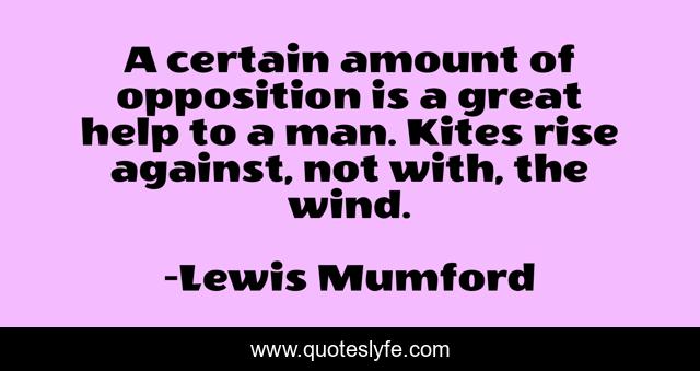 This page presents the quote "A certain amount of opposition is a great help to a man. Kites rise against, not with, the wind.". Author of this quote is Lewis Mumford. This quote is about great, help, man,.