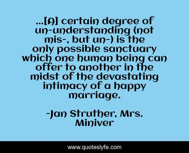 This page presents the quote "...[A] certain degree of un-understanding (not mis-, but un-) is the only possible sanctuary which one human being can offer to another in the midst of the devastating intimacy of a happy marriage.". Author of this quote is Jan Struther, Mrs. Miniver. This quote is about marriage, happiness,.