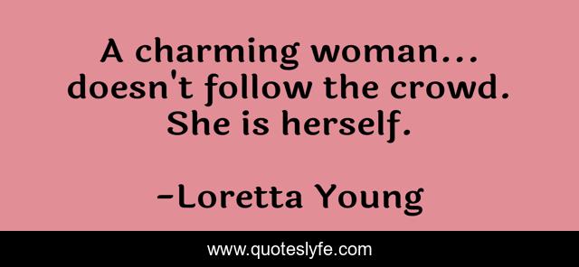This page presents the quote "A charming woman... doesn't follow the crowd. She is herself.". Author of this quote is Loretta Young. This quote is about woman, she, charming,.