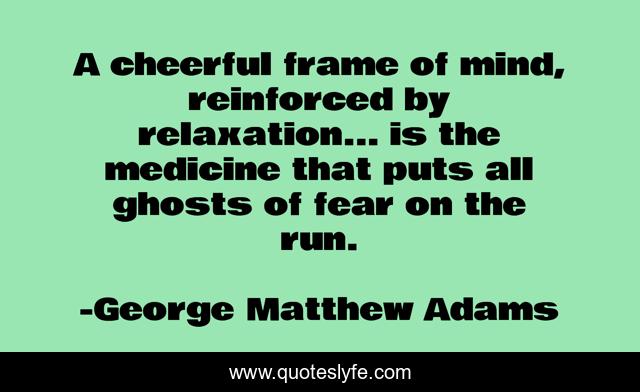 This page presents the quote "A cheerful frame of mind, reinforced by relaxation... is the medicine that puts all ghosts of fear on the run.". Author of this quote is George Matthew Adams. This quote is about medicine, mind, run,.