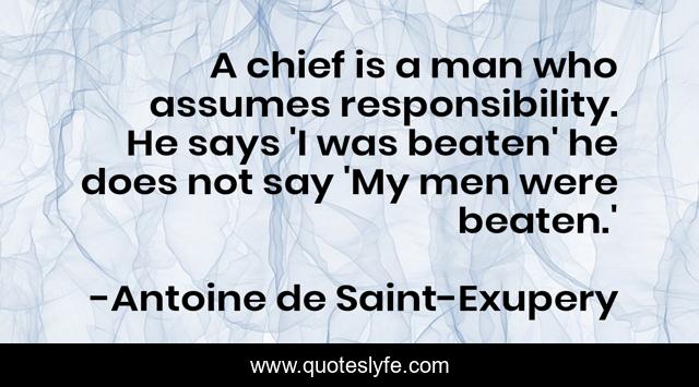 This page presents the quote "A chief is a man who assumes responsibility. He says 'I was beaten' he does not say 'My men were beaten.'". Author of this quote is Antoine de Saint-Exupery. This quote is about leadership, leaders,.