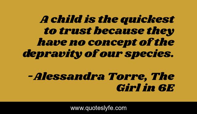 This page presents the quote "A child is the quickest to trust because they have no concept of the depravity of our species.". Author of this quote is Alessandra Torre, The Girl in 6E. This quote is about trust, children, evil,.