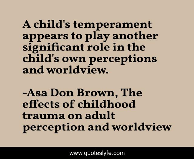 This page presents the quote "A child's temperament appears to play another significant role in the child's own perceptions and worldview.". Author of this quote is Asa Don Brown, The effects of childhood trauma on adult perception and worldview. This quote is about maltreatment, abuse, trauma, neglect, asa-don-brown,.
