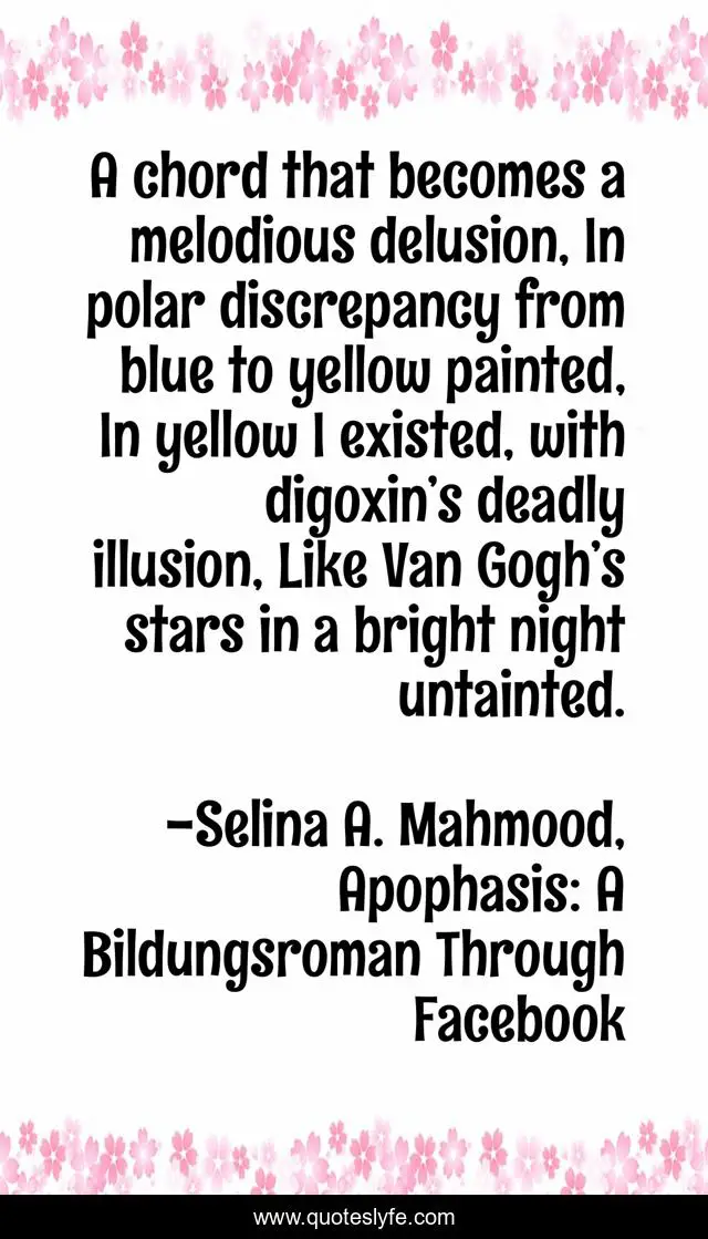 This page presents the quote "A chord that becomes a melodious delusion, In polar discrepancy from blue to yellow painted, In yellow I existed, with digoxin’s deadly illusion, Like Van Gogh’s stars in a bright night untainted.". Author of this quote is Selina A. Mahmood, Apophasis: A Bildungsroman Through Facebook. This quote is about van-gogh, art, poetry, depression, love, affection,.