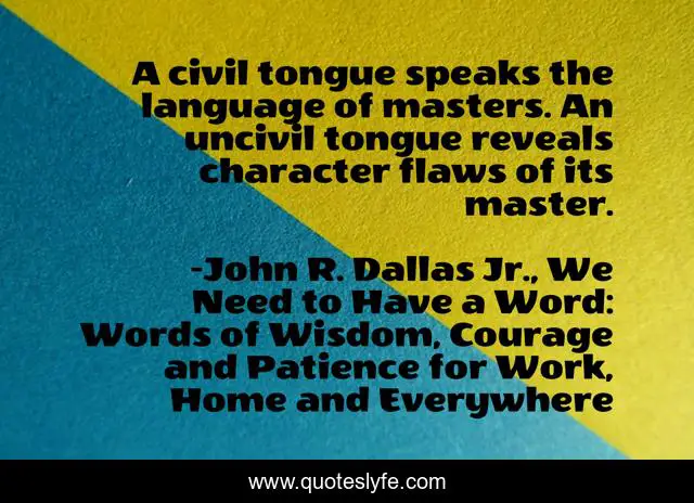This page presents the quote "A civil tongue speaks the language of masters. An uncivil tongue reveals character flaws of its master.". Author of this quote is John R. Dallas Jr., We Need to Have a Word: Words of Wisdom, Courage and Patience for Work, Home and Everywhere. This quote is about civilized, civility, character, language,.