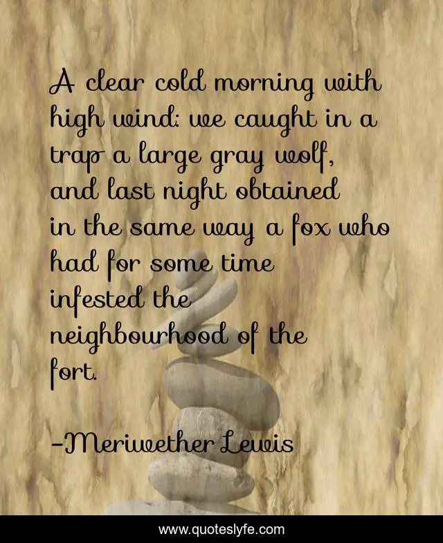 This page presents the quote "A clear cold morning with high wind: we caught in a trap a large gray wolf, and last night obtained in the same way a fox who had for some time infested the neighbourhood of the fort.". Author of this quote is Meriwether Lewis. This quote is about time, wolf, night,.