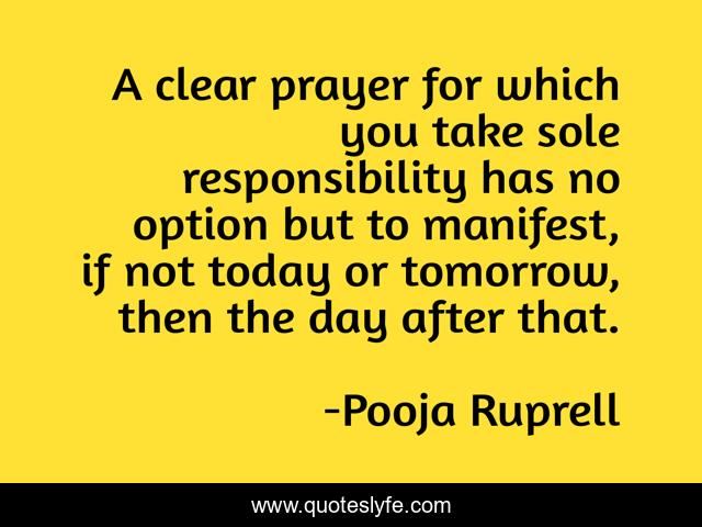 This page presents the quote "A clear prayer for which you take sole responsibility has no option but to manifest, if not today or tomorrow, then the day after that.". Author of this quote is Pooja Ruprell. This quote is about perseverance, passion, prayer,.
