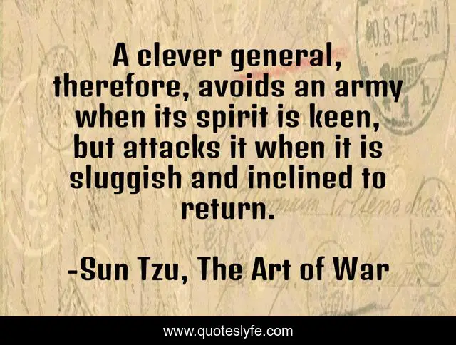 This page presents the quote "A clever general, therefore, avoids an army when its spirit is keen, but attacks it when it is sluggish and inclined to return.". Author of this quote is Sun Tzu, The Art of War. This quote is about clever, army, strategy, attack, spirit, war,.