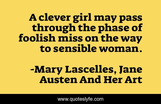 This page presents the quote "A clever girl may pass through the phase of foolish miss on the way to sensible woman.". Author of this quote is Mary Lascelles, Jane Austen And Her Art. This quote is about girl, woman,.
