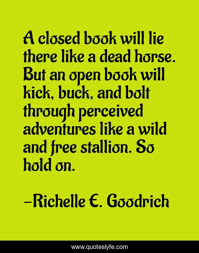 This page presents the quote "A closed book will lie there like a dead horse. But an open book will kick, buck, and bolt through perceived adventures like a wild and free stallion. So hold on.". Author of this quote is Richelle E. Goodrich. This quote is about horse, reading, richelle, read, tales, adventures, tale, book, books,.
