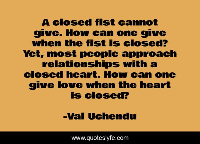 This page presents the quote "A closed fist cannot give. How can one give when the fist is closed? Yet, most people approach relationships with a closed heart. How can one give love when the heart is closed?". Author of this quote is Val Uchendu. This quote is about relationships, heart, love, relationship, relationship-advice, heartbreak, relationships-101, affection,.
