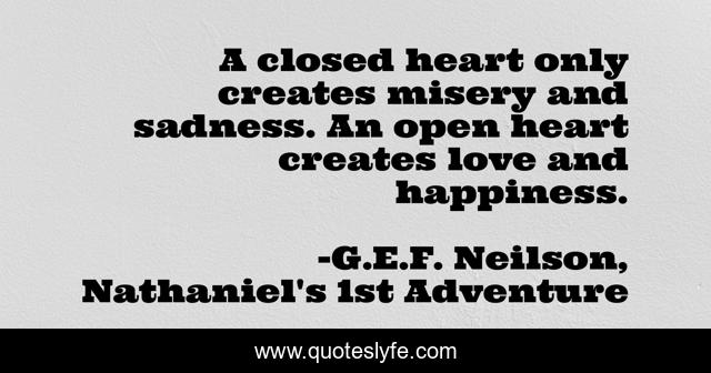 This page presents the quote "A closed heart only creates misery and sadness. An open heart creates love and happiness.". Author of this quote is G.E.F. Neilson, Nathaniel's 1st Adventure. .