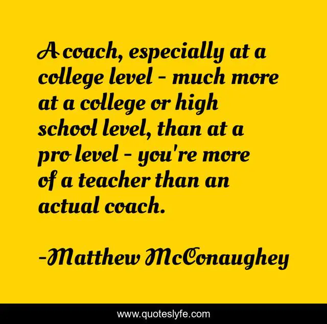 This page presents the quote "A coach, especially at a college level - much more at a college or high school level, than at a pro level - you're more of a teacher than an actual coach.". Author of this quote is Matthew McConaughey. This quote is about school, high school, college,.