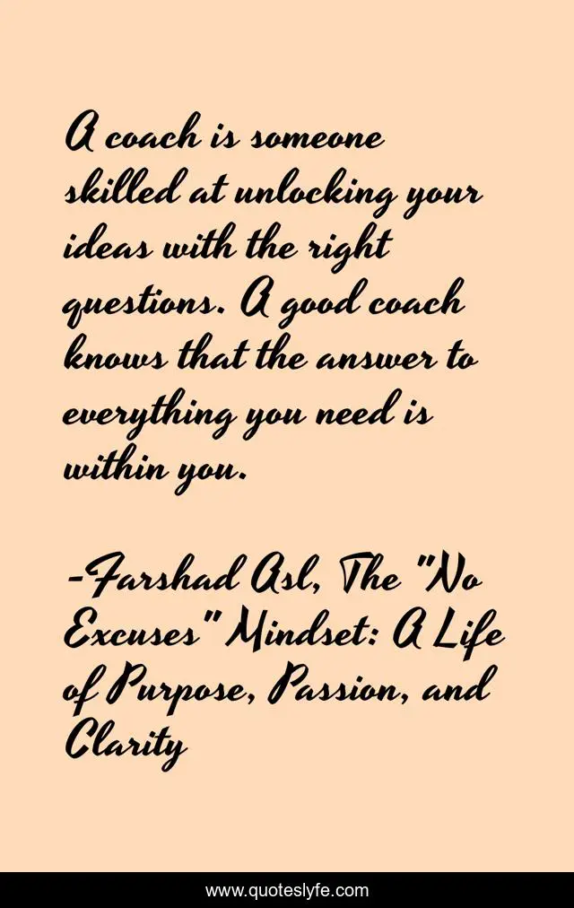 This page presents the quote "A coach is someone skilled at unlocking your ideas with the right questions. A good coach knows that the answer to everything you need is within you.". Author of this quote is Farshad Asl, The "No Excuses" Mindset: A Life of Purpose, Passion, and Clarity. This quote is about coaching, answers, questions,.