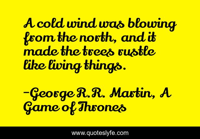 This page presents the quote "A cold wind was blowing from the north, and it made the trees rustle like living things.". Author of this quote is George R.R. Martin, A Game of Thrones. This quote is about george-r-r-martin, north, winter, a-song-of-ice-and-fire, snow, trees, coldness, forest, the-wall,.