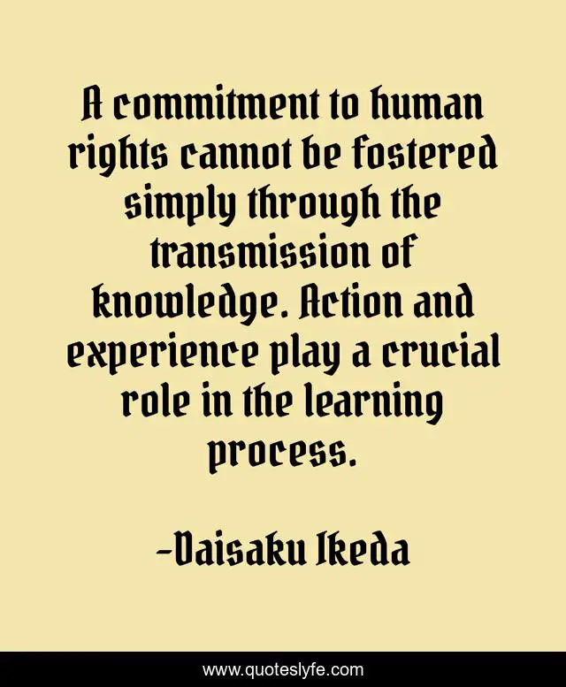 This page presents the quote "A commitment to human rights cannot be fostered simply through the transmission of knowledge. Action and experience play a crucial role in the learning process.". Author of this quote is Daisaku Ikeda. This quote is about knowledge, experience,.