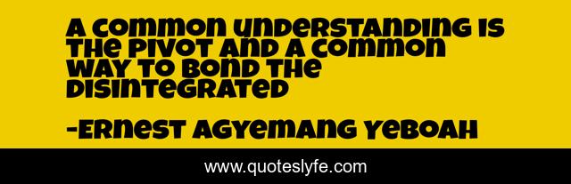 This page presents the quote "A common understanding is the pivot and a common way to bond the disintegrated". Author of this quote is Ernest Agyemang Yeboah. This quote is about peace-making, understanding-oneself-and-others, understanding-others, freedom, misunderstanding, understanding, love, affection, peace-on-earth,.