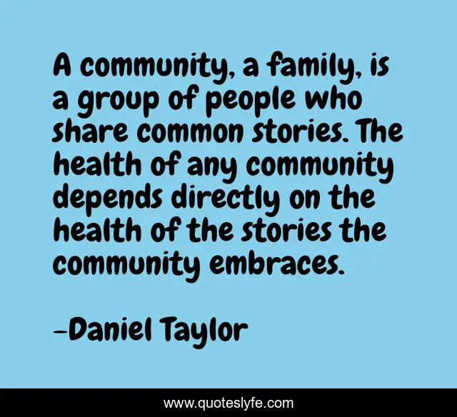 This page presents the quote "A community, a family, is a group of people who share common stories. The health of any community depends directly on the health of the stories the community embraces.". Author of this quote is Daniel Taylor. .