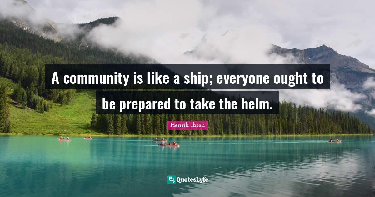This page presents the quote "A community is like a ship; everyone ought to be prepared to take the helm.". Author of this quote is Henrik Ibsen. This quote is about community, be prepared, helm, community living, preparation, ought, leadership,.