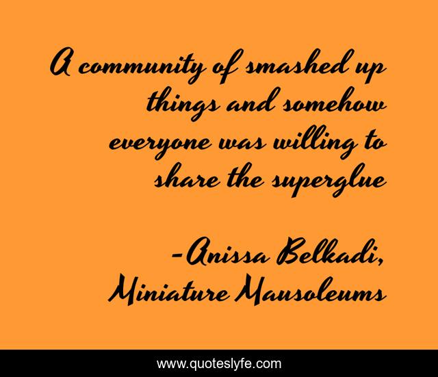 This page presents the quote "A community of smashed up things and somehow everyone was willing to share the superglue". Author of this quote is Anissa Belkadi, Miniature Mausoleums. .