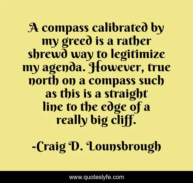 This page presents the quote "A compass calibrated by my greed is a rather shrewd way to legitimize my agenda. However, true north on a compass such as this is a straight line to the edge of a really big cliff.". Author of this quote is Craig D. Lounsbrough. This quote is about danger, fall, selfishness, self, destination, stupidity, legitimize, falling, map,.