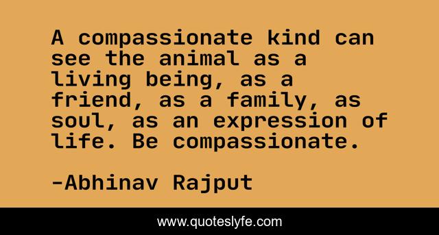 This page presents the quote "A compassionate kind can see the animal as a living being, as a friend, as a family, as soul, as an expression of life. Be compassionate.". Author of this quote is Abhinav Rajput. .