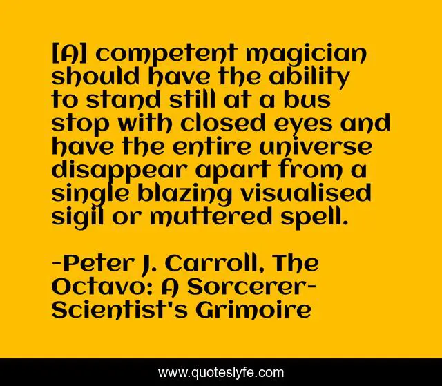This page presents the quote "[A] competent magician should have the ability to stand still at a bus stop with closed eyes and have the entire universe disappear apart from a single blazing visualised sigil or muttered spell.". Author of this quote is Peter J. Carroll, The Octavo: A Sorcerer-Scientist's Grimoire. This quote is about magic, chaos-magic,.