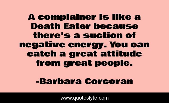 This page presents the quote "A complainer is like a Death Eater because there's a suction of negative energy. You can catch a great attitude from great people.". Author of this quote is Barbara Corcoran. This quote is about great, death, negative,.