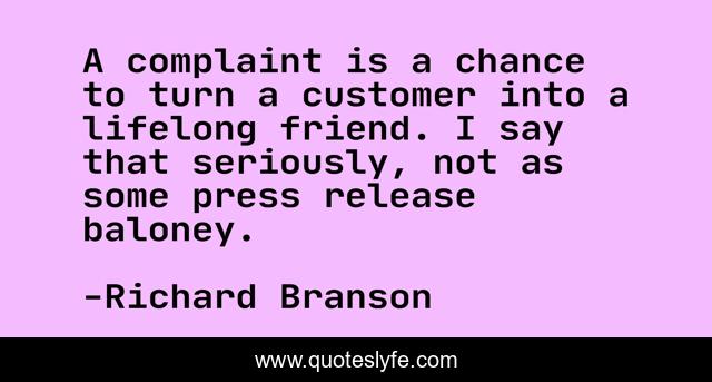 This page presents the quote "A complaint is a chance to turn a customer into a lifelong friend. I say that seriously, not as some press release baloney.". Author of this quote is Richard Branson. This quote is about customer, seriously, friend,.