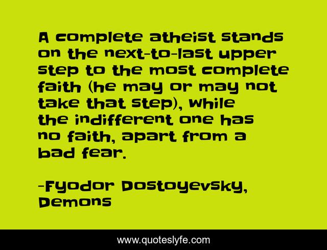 This page presents the quote "A complete atheist stands on the next-to-last upper step to the most complete faith (he may or may not take that step), while the indifferent one has no faith, apart from a bad fear.". Author of this quote is Fyodor Dostoyevsky, Demons. This quote is about atheism, faith, apathy,.