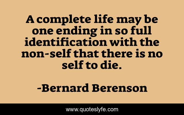 This page presents the quote "A complete life may be one ending in so full identification with the non-self that there is no self to die.". Author of this quote is Bernard Berenson. This quote is about enthusiasm, life, death, inspirational,.