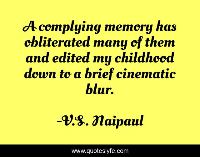 This page presents the quote "A complying memory has obliterated many of them and edited my childhood down to a brief cinematic blur.". Author of this quote is V.S. Naipaul. This quote is about memory, the-mimic-men,.