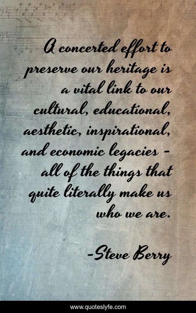 This page presents the quote "A concerted effort to preserve our heritage is a vital link to our cultural, educational, aesthetic, inspirational, and economic legacies - all of the things that quite literally make us who we are.". Author of this quote is Steve Berry. This quote is about economic, effort, heritage,.