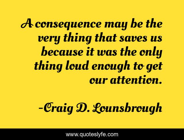 This page presents the quote "A consequence may be the very thing that saves us because it was the only thing loud enough to get our attention.". Author of this quote is Craig D. Lounsbrough. This quote is about pay-attention, saves, calibrate, consequences, attention, direct, adjustment, redirection, adjust,.
