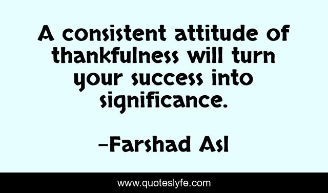 This page presents the quote "A consistent attitude of thankfulness will turn your success into significance.". Author of this quote is Farshad Asl. This quote is about behaviour, attitude, thankfullness, success, significance,.