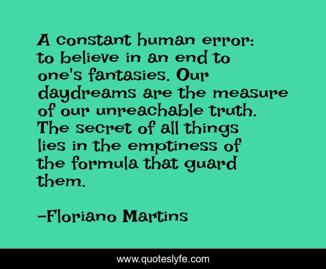 This page presents the quote "A constant human error: to believe in an end to one's fantasies. Our daydreams are the measure of our unreachable truth. The secret of all things lies in the emptiness of the formula that guard them.". Author of this quote is Floriano Martins. This quote is about surrealism, dreams, fantasies,.