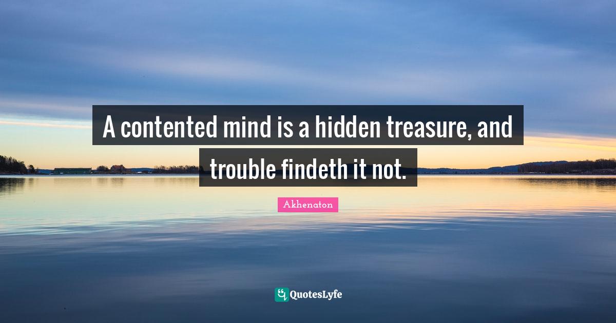 This page presents the quote "A contented mind is a hidden treasure, and trouble findeth it not.". Author of this quote is Akhenaton. This quote is about trouble, mind, treasure,.