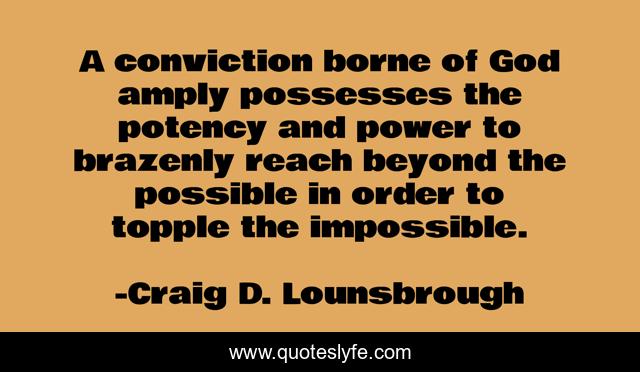 This page presents the quote "A conviction borne of God amply possesses the potency and power to brazenly reach beyond the possible in order to topple the impossible.". Author of this quote is Craig D. Lounsbrough. This quote is about brave, god, possible, goals, impossible, bravery,.