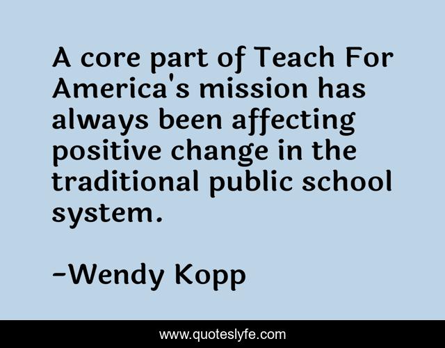 This page presents the quote "A core part of Teach For America's mission has always been affecting positive change in the traditional public school system.". Author of this quote is Wendy Kopp. This quote is about school, america, change,.