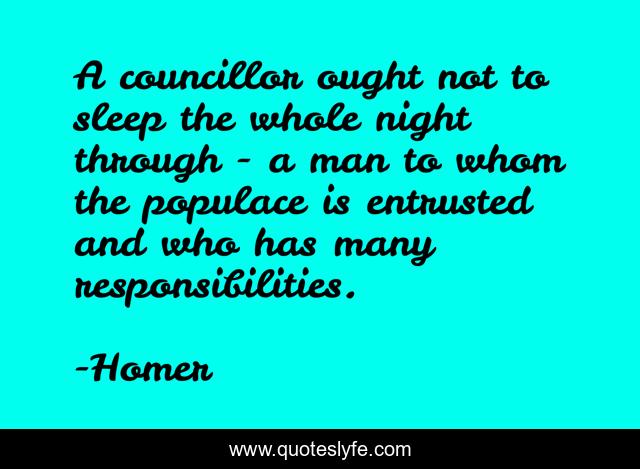 This page presents the quote "A councillor ought not to sleep the whole night through - a man to whom the populace is entrusted and who has many responsibilities.". Author of this quote is Homer. .
