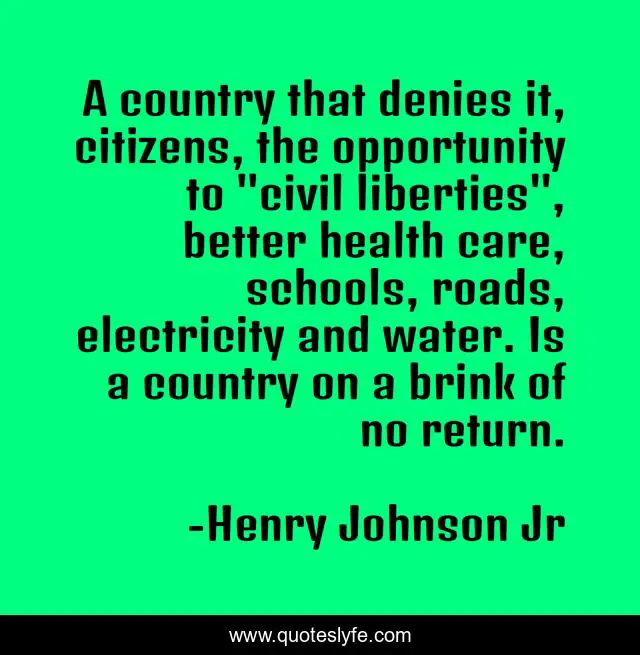 This page presents the quote "A country that denies it, citizens, the opportunity to "civil liberties", better health care, schools, roads, electricity and water. Is a country on a brink of no return.". Author of this quote is Henry Johnson Jr. This quote is about liberia, liberian-writer, writer, quotes-on-country, quotes-about-life, poet, quotes-to-make-you-think,.