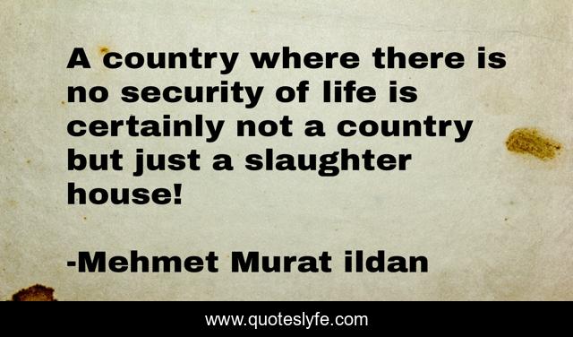 This page presents the quote "A country where there is no security of life is certainly not a country but just a slaughter house!". Author of this quote is Mehmet Murat ildan. This quote is about security-of-life, mehmet-murat-ildan, ildan-wise-sayings, slaughterhouse, ildan-wisdom, turkish, turkish-playwrights, slaughter, ildan-words,.