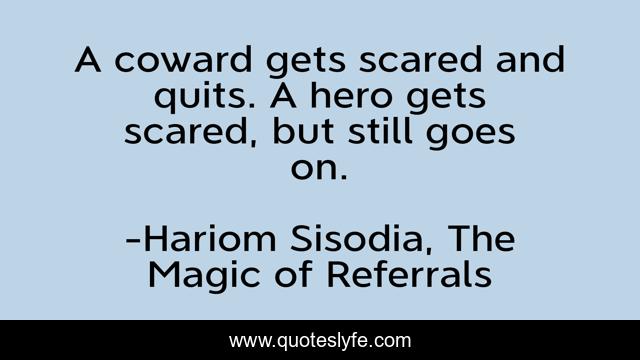 This page presents the quote "A coward gets scared and quits. A hero gets scared, but still goes on.". Author of this quote is Hariom Sisodia, The Magic of Referrals. This quote is about enthusiasm, inspirational,.