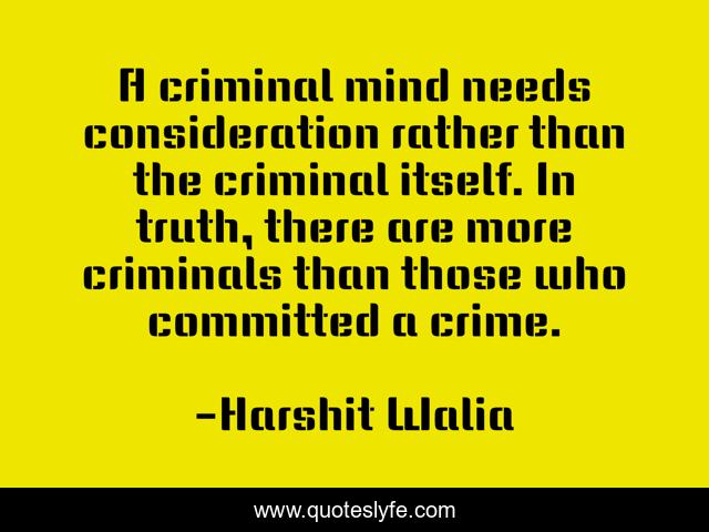 This page presents the quote "A criminal mind needs consideration rather than the criminal itself. In truth, there are more criminals than those who committed a crime.". Author of this quote is Harshit Walia. This quote is about social-welfare, criminal-mind, criminal, crime, society,.